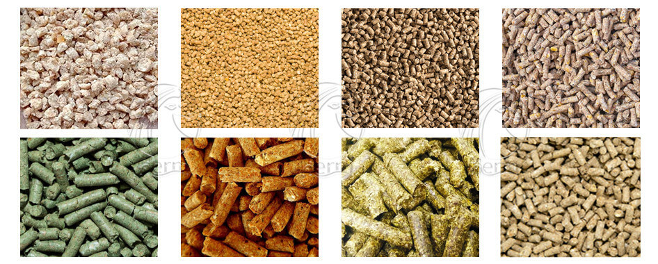 This feed pellet production line can produce feed for meat chicken, broilers, laying hens, small baby chicken feed, cattle feed, pig feed, duck feed, sheep feed, poultry feed, livestock feed, goat feed, fish feed, shrimp feed, crab feed, aquatic feed, etc. Such as 2-4mm diameter chick feed pellets and pig feed pellets. 2-5mm rabbit feed pellets, 4-8mm cattle or sheep feed pellets.